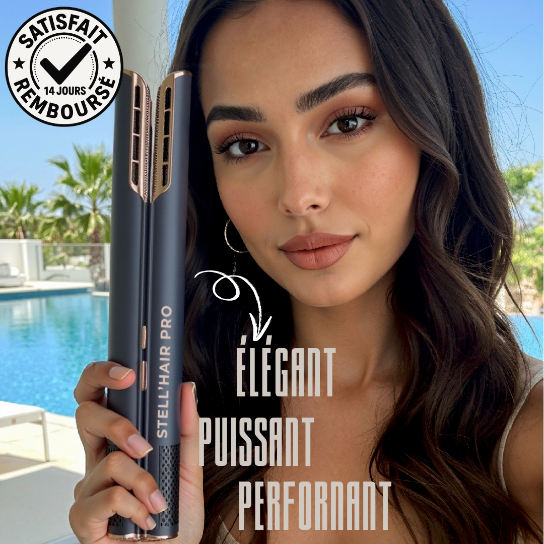 Société Française, Brevet déposé pour la double sortie d'air qui protège et sèche efficacement vos cheveux. Multi usage avec sa brosse chauffante mais également refroidissante, option lissage avec une efficacité prouvée en moins 15 minutes.